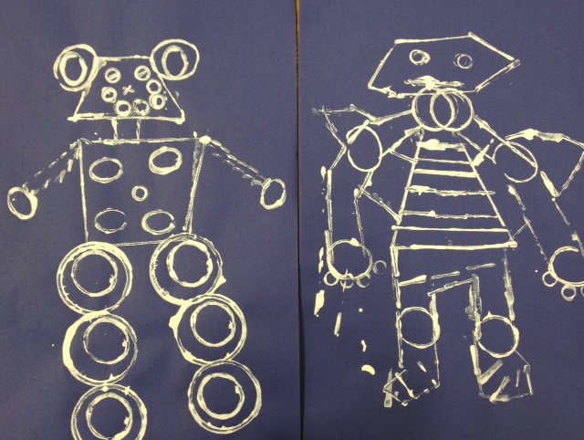 First, we designed robots in our sketchbooks, and wrote what they did for us. The next week we came in and talked about technology some more, and how we could use found objects to create a different kind of robot than the one we drew--one that was made from stamping our lines with the found objects. Below you will find some of the results of our endeavors. Our first grade engineers really rocked the house with their stamped out bots. Way to go, First Grade. Take a look: