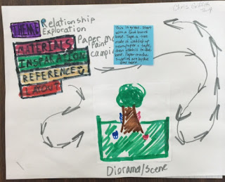 Once they had figured out what they wanted to accomplish in their artwork, they built a complex design plan through mapping it in their sketchbook. They began to research on the iPads and computers in the classroom; they could also go to the media center to use the computers there, or bring their own devices. They had to come up with at least one supporting reference picture, but they could have up to three. They uploaded them to a Google Drive account and I retrieved them and printed them, and they were added to the sketchbook maps. Once they had their theme, materials list, explanation of their inspiration, reference picture, and layout, they followed up with a paragraph that explained what their underlying meaning was to their planned artwork, and how they planned to get the piece done. Students could choose any materials I had available, or even bring in their own materials. My office has been chock-full of extra stuff kids have brought in! We had some discussion about their projects, and as I looked through their sketchbook maps, I made notes for them to remind them of what we had discussed for their projects as they began.